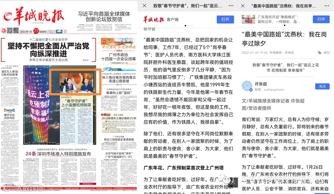 1月25日,羊城晚报聚焦报道了广深高速“最美中国路姐”沈燕秋的“岗亭除夕”,记录了收费员在春节期间放弃与家人团聚的机会,坚守三尺岗亭,守护司乘归家路的故事;1月26日,作为高速公路行业的代表,沈燕秋受邀参加了由广东省农业农村厅主办的新春联谊会