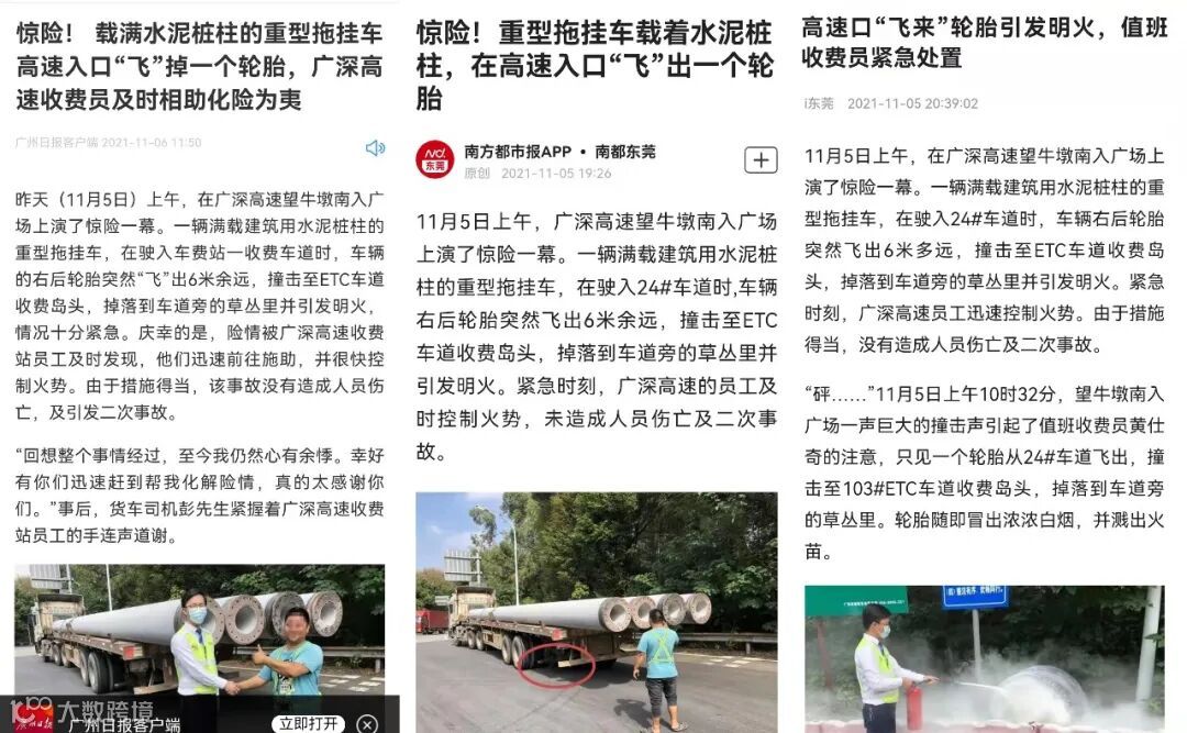 “砰……砰……”11月5日10时32分,在望牛墩南向入口广场,巨大的撞击声引起了收费员黄仕奇的注意。只见一辆重型拖挂车停靠在24#车道,其后轮飞出撞击至103#ETC车道收费岛头,掉落到车道旁的草丛里,随即冒出浓烟。
