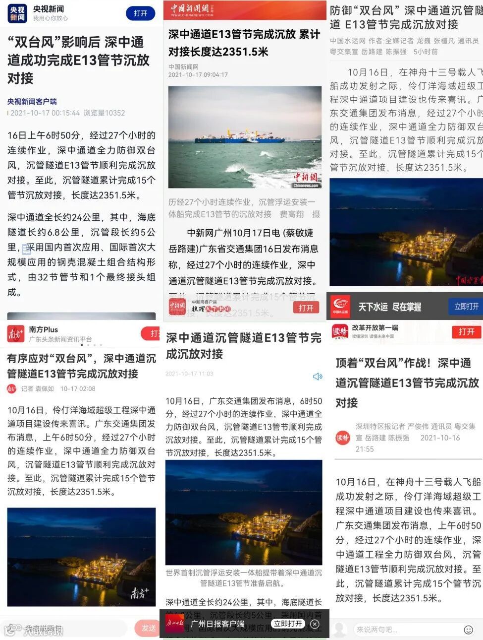 10月16日,在神舟十三号载人飞船成功发射之际,伶仃洋海域超级工程深中通道项目建设也传来喜讯。上午6时50分,经过27个小时的连续作业,深中通道全力防御“双台风”,沉管隧道E13管节顺利完成沉放对接。至此,沉管隧道累计完成15个管节沉放对接,长度达2351.5米。