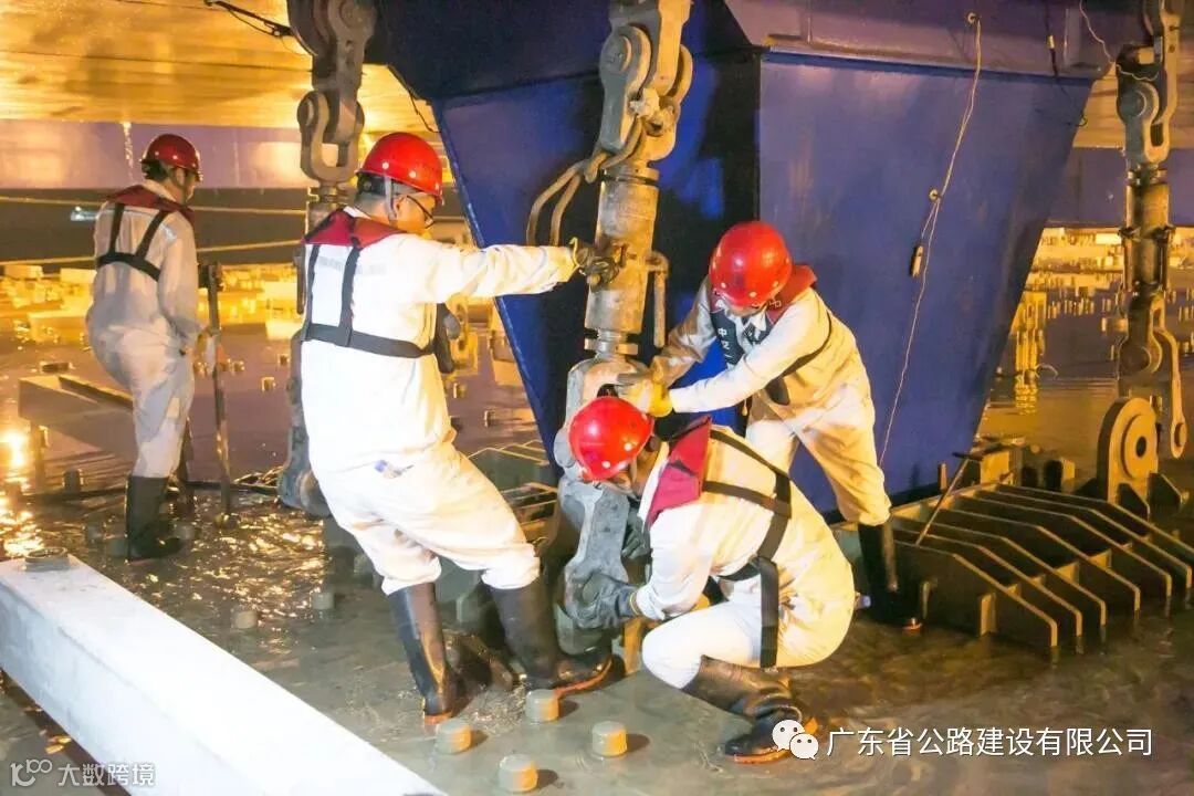 深中通道施工人员正在拆除船管连接装置,为E13管节沉放对接做好准备工作