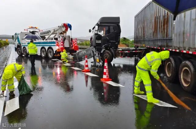 中江高速江鹤路政队路政员赵仲飞、顾军辉赶到现场后迅速做好安全围蔽,并做好现场交通指挥工作。12时27分,消防人员到达现场参与救援。经过15分钟的扑救,明火被扑灭。13时02分,拯救人员将事故车辆拖离现场。随后,路政员协助养护人员对路面进行清理,确保道路行车安全。因中江高速发现与组织救援及时,货车除车头烧毁外,整车货物完好无损,司机对中江高速的热心帮助表示衷心感谢。