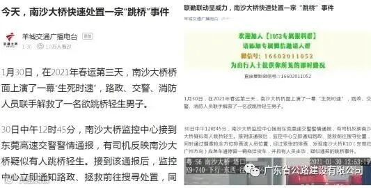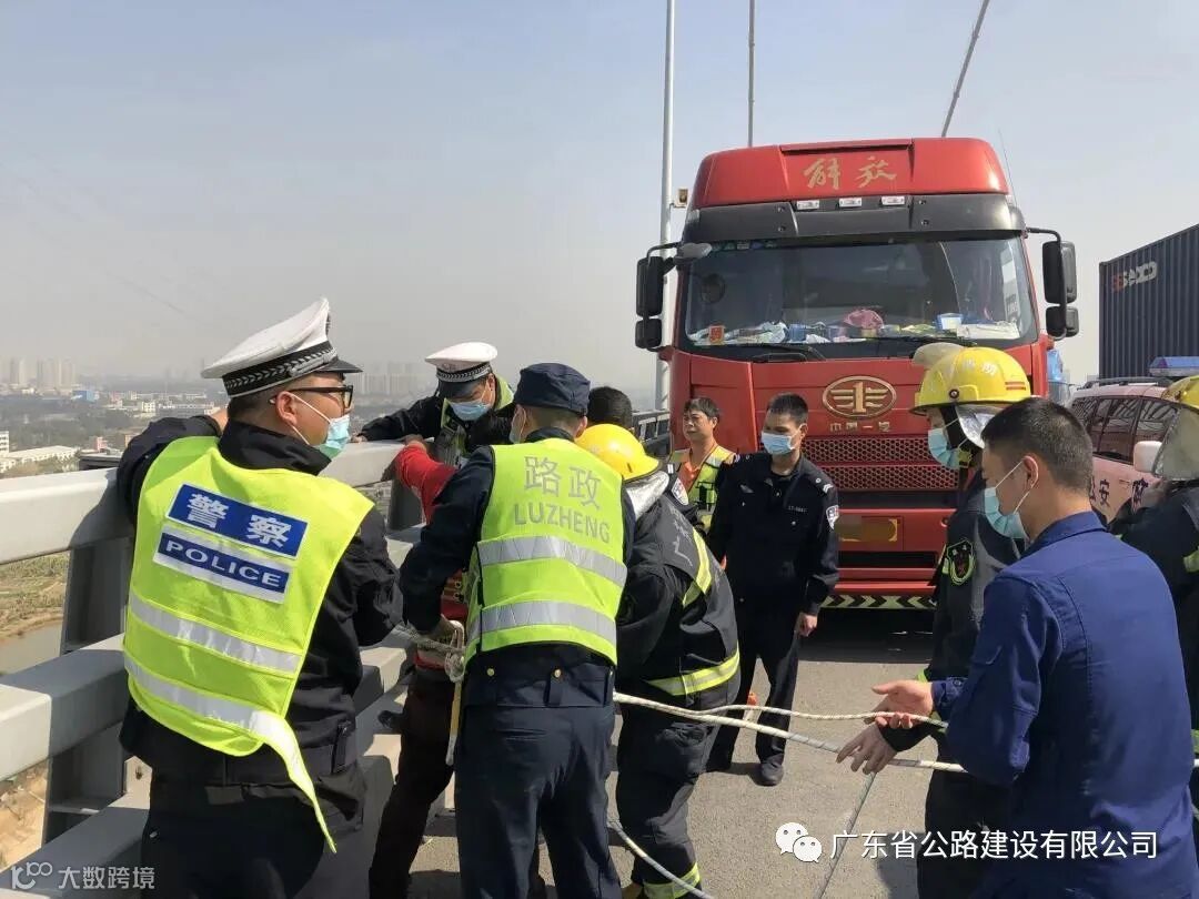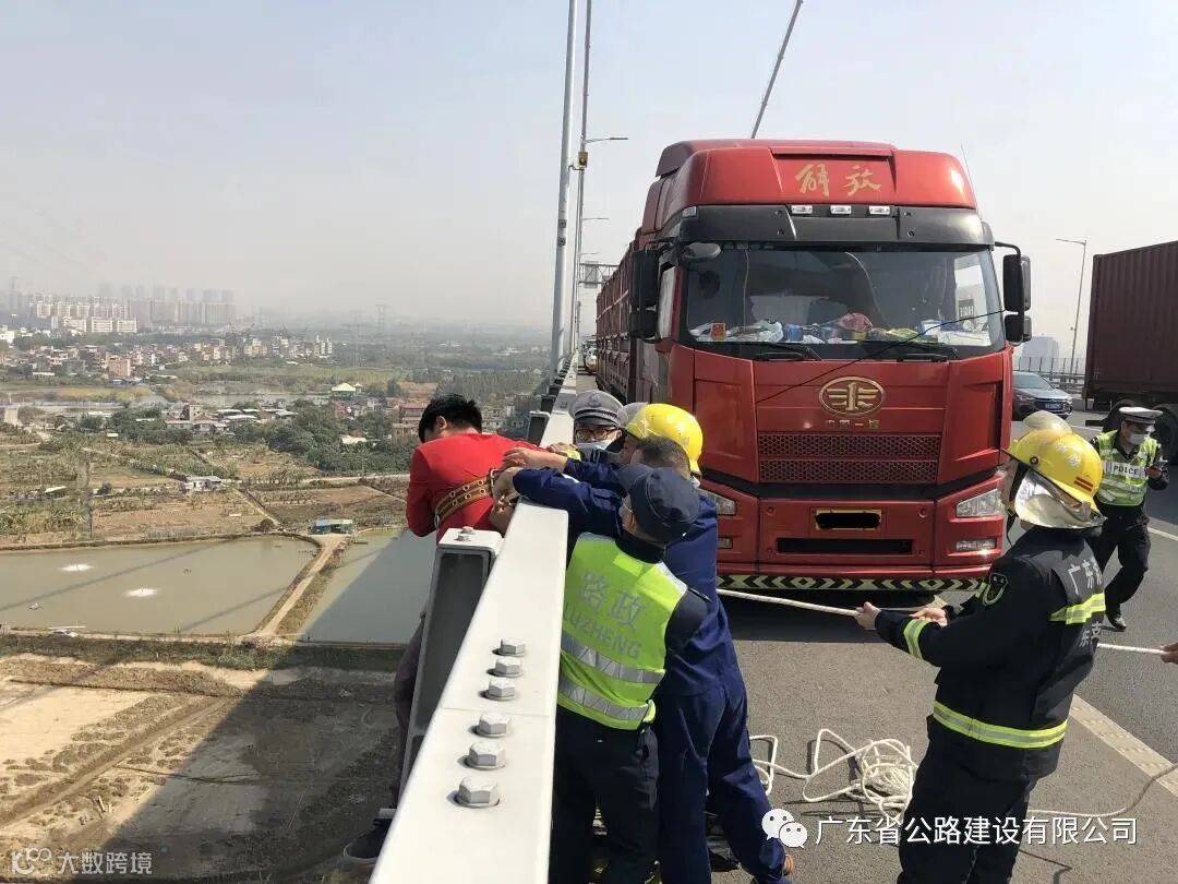 广东省公路建设有限公司当天中午12时45分,南沙大桥监控中心接到东莞高速交警警情通报,有司机反映南沙大桥疑似有人跳桥轻生。接到通报后,监控中心立即通知路政、拯救前往搜寻处置,同时通过摄像枪全方位排查该人员位置。经过紧张地排查,发现南沙大桥K10(东莞往广州方向)应急车道停留一辆拖挂货车,并且有人员走动,疑似通报的跳桥事件。