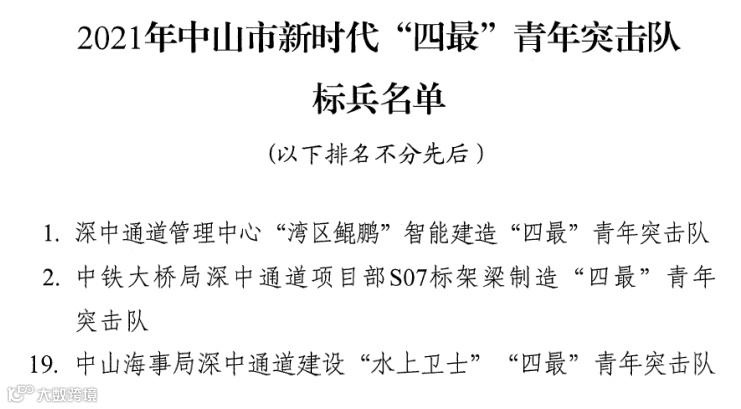 近日,深中通道管理中心“湾区鲲鹏”智能建造“四最”青年突击队、中铁大桥局深中通道项目部S07标制架梁“四最”青年突击队、中山海事局深中通道建设“水上卫士”“四最”青年突击队荣获首批中山市新时代“四最”青年突击队标兵称号。本次评选聚焦基层一线、覆盖不同领域,展现了最积极、最有生气、最肯学习、最少保守思想的新时代青年风貌。