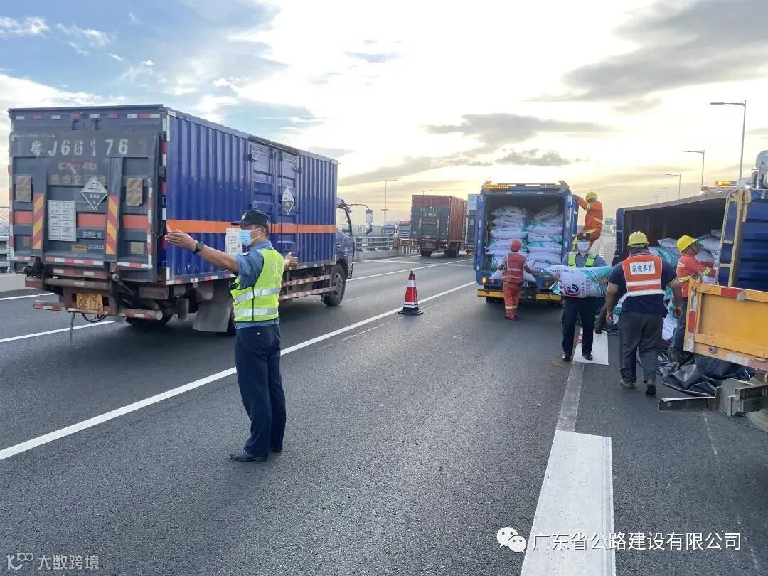 货车侧翻9吨饲料散落路面,南沙大桥快速处置