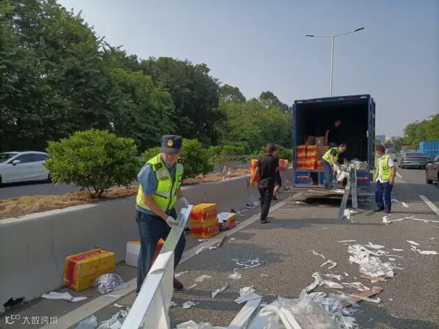 方向),一辆重型牵引货车停靠在行车道上,车上的铝材、电子产品、食品等货物散落一地。广深高速路政二中队路政员吴文杰、饶杏村接报后赶到现场,并迅速做好现场安全围蔽。
