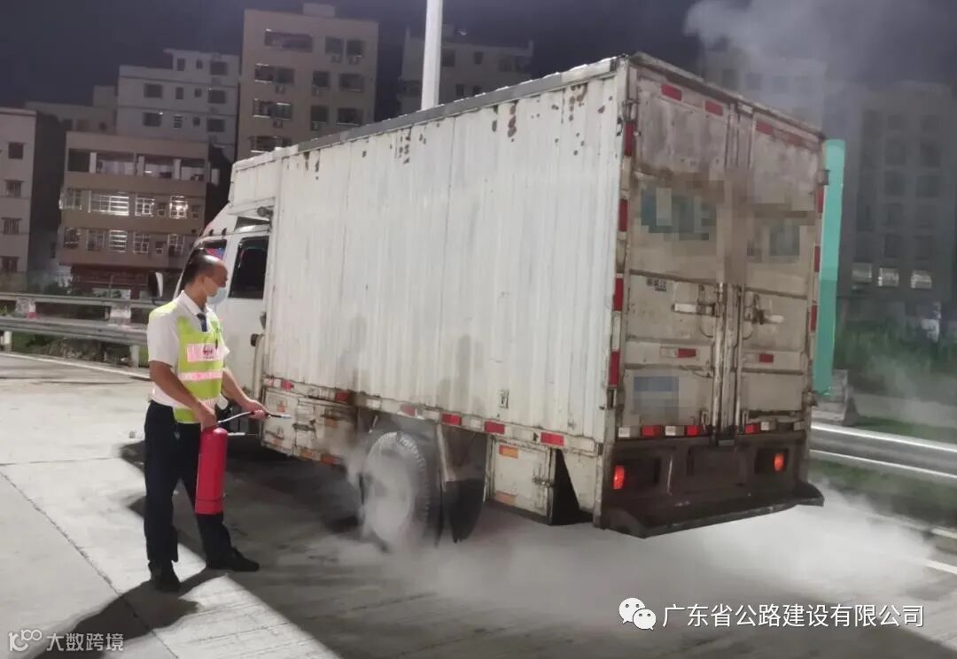 火情就是命令。邓昭辉提起灭火器朝货车跑去。由于发现及时,火势尚处于可控状态。2分钟后,明火被扑灭。接着,他叫上两名工作人员用自来水为货车轮胎降温。司机对邓昭辉说:“幸好你及时叫停了我,要是这火蔓延开来,我这车货可能就不保了。”随后,司机致电中江高速监控中心,表扬共和站员工助人为乐的行为。