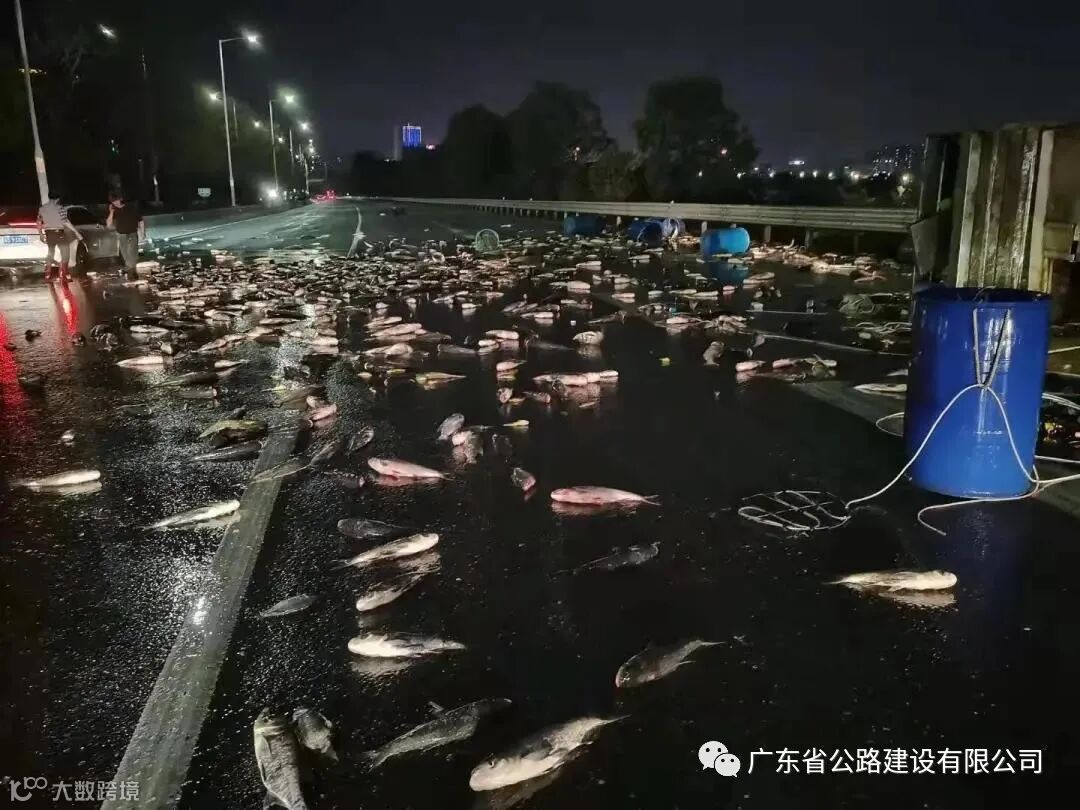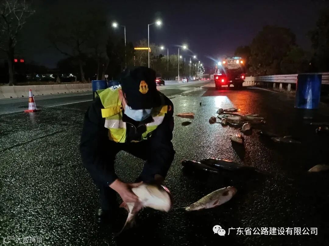 22点32分,正在进行日常巡逻的广深高速路政二中队路政员邓广明和聂庆红发现了这一情况,马上将情况上报监控中心,并及时通知交警、养护到场协助。在确认车主并未受伤、状况良好后,两人立即分工合作,迅速开展“救鱼”行动:聂庆红立即用反光警示锥做好安全围蔽,并带上水桶帮忙;为了最大限度减少车主损失,提高鱼苗存活率,邓广明徒手帮助郑先生快速捡拾路面散落的鱼苗。