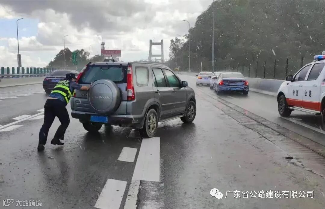 在处理事故的过程中,突然下起了大雨,为了能尽快将事故车辆移至安全区域,解封后方拥堵车辆,莫纯威、陈健钊冒着大雨,尽全力将一辆事故车推行了10米,移动到安全地带。随后,拖车到达现场并将事故车辆带离,路政员引导其余可以行驶的事故车辆,行驶到南沙B出口的高速公路快速理赔点。15时53分,路面恢复正常通行。
