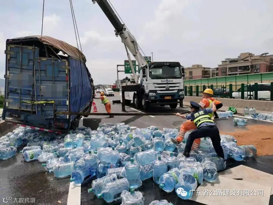 货车侧翻近100桶水掉落,江中路政员变身“搬运工”