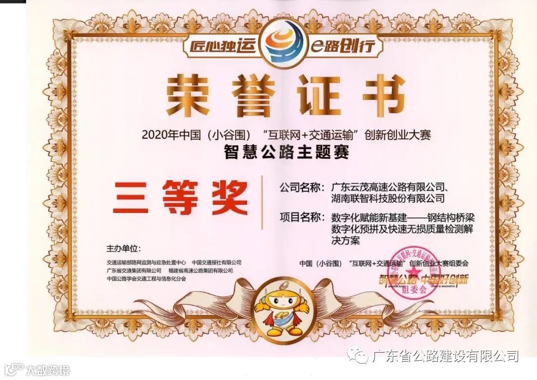 近日,2020年中国(小谷围)“互联网+交通运输”创新创业大赛之智慧公路主题赛决赛在广州举行。经过初选、晋级赛、决赛等激烈角逐,云茂高速联合湖南联智科技股份有限公司参赛的“数字化赋能新基建——钢结构桥梁数字化预拼及快速无损质量检测解决方案”获得三等奖。