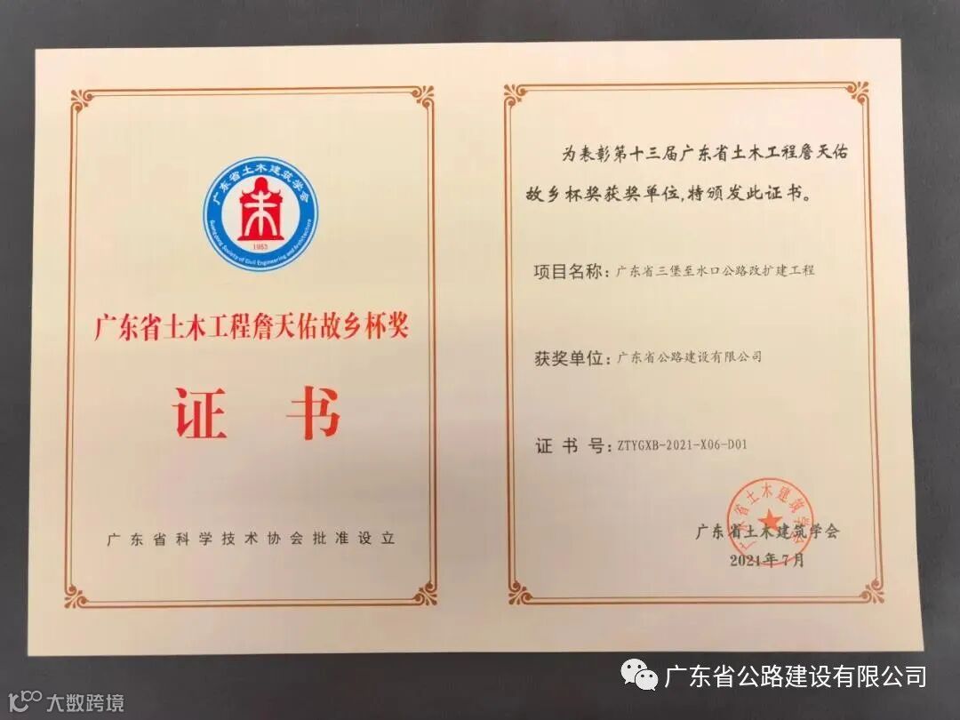 越秀国际中心组织召开了广东省土木建筑工程技术创新交流及成果展示会。会上,广东省三堡至水口公路改扩建工程(以下简称佛开南改扩建项目)荣获第十三届广东省土木工程詹天佑故乡杯奖,并成功入选