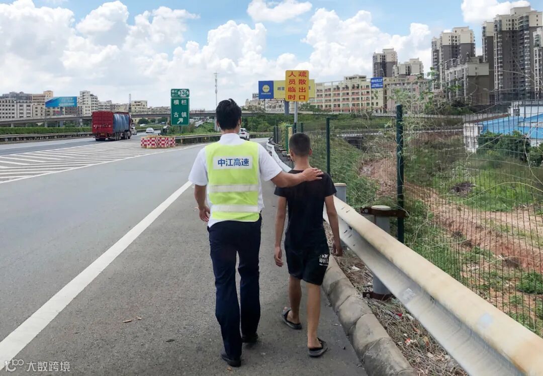 10分钟后,两人在横栏站出口匝道处找到了男孩,并将他带到横栏站办公楼。路政与交警人员也先后赶到现场。男孩告诉