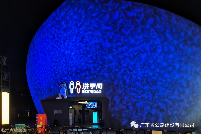 改造后,以太空科技元素为主题的厚街南行服务区公共卫生间全新亮相,一共二层占地约700平方米。门口醒目的洗手间标志上摆设着太空人的卡通形象,夜间配以水纹灯外墙投影,给人一种星空遨游感。厕所内主要墙面涂画了天空星月图,并且在墙体挂装卡通太空人、星空画等凸显星空元素,营造星空之旅的空间氛围。整洁明亮、主题鲜明的公共卫生间吸引了不少游客驻足打卡。