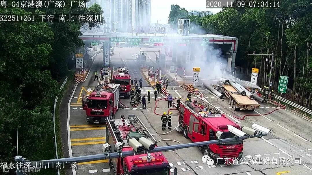 广东省公路建设有限公司11月9日上午,在广深高速福永收费站往深圳方向出口广场上演了惊险一幕。一辆满载建筑用水泥管桩的湘牌重型拖挂车,在驶入车道时因刹车失灵失控撞向车道安全岛并引发明火,情况十分危急。广深高速及时发现险情,紧急联合相关部门开展救援,将明火扑灭。