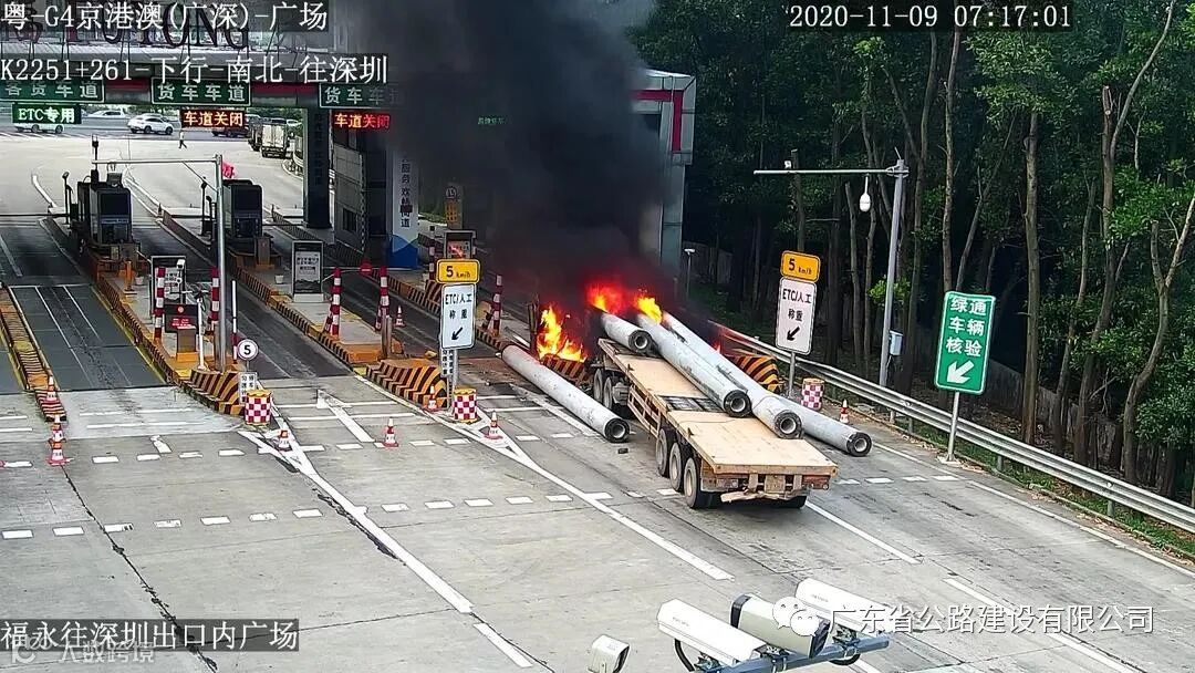 11月9日上午,在广深高速福永收费站往深圳方向出口广场上演了惊险一幕。一辆满载建筑用水泥管桩的湘牌重型拖挂车,在驶入车道时因刹车失灵失控撞向车道安全岛并引发明火,情况十分危急。广深高速及时发现险情,紧急联合相关部门开展救援,将明火扑灭。