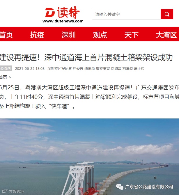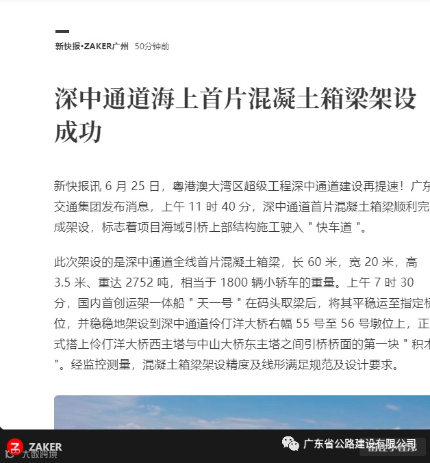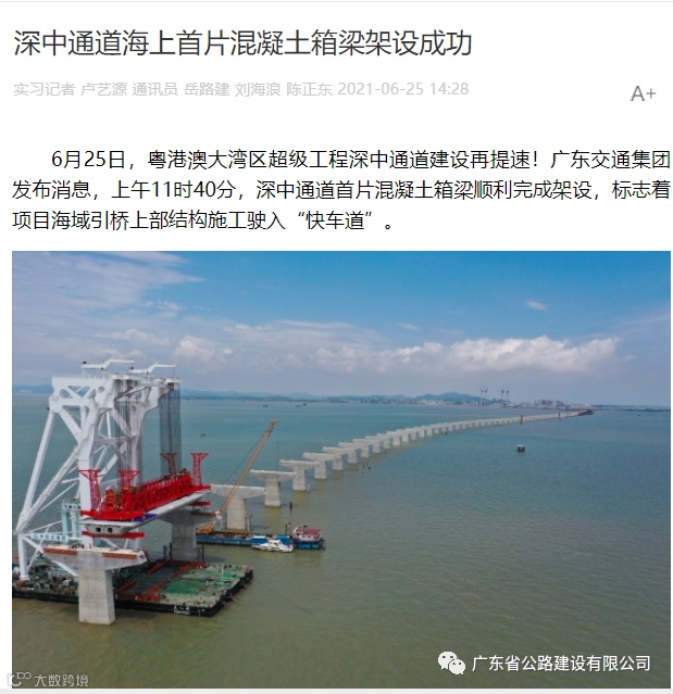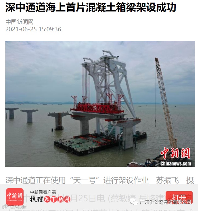 6月25日上午11时40分,深中通道海上首片混凝土箱梁顺利完成架设,标志着项目海域引桥上部结构施工驶入“快车道”,深中通道建设再提速。
