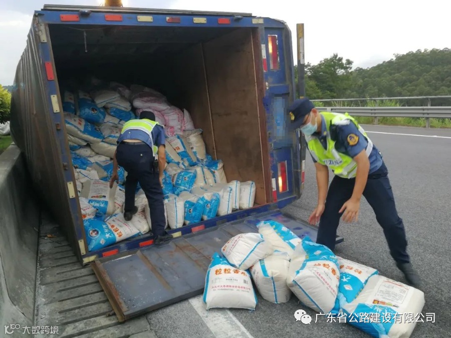拯救人员先后赶到现场,只见一辆货车侧翻在快车道上,地面散落了几袋大米。