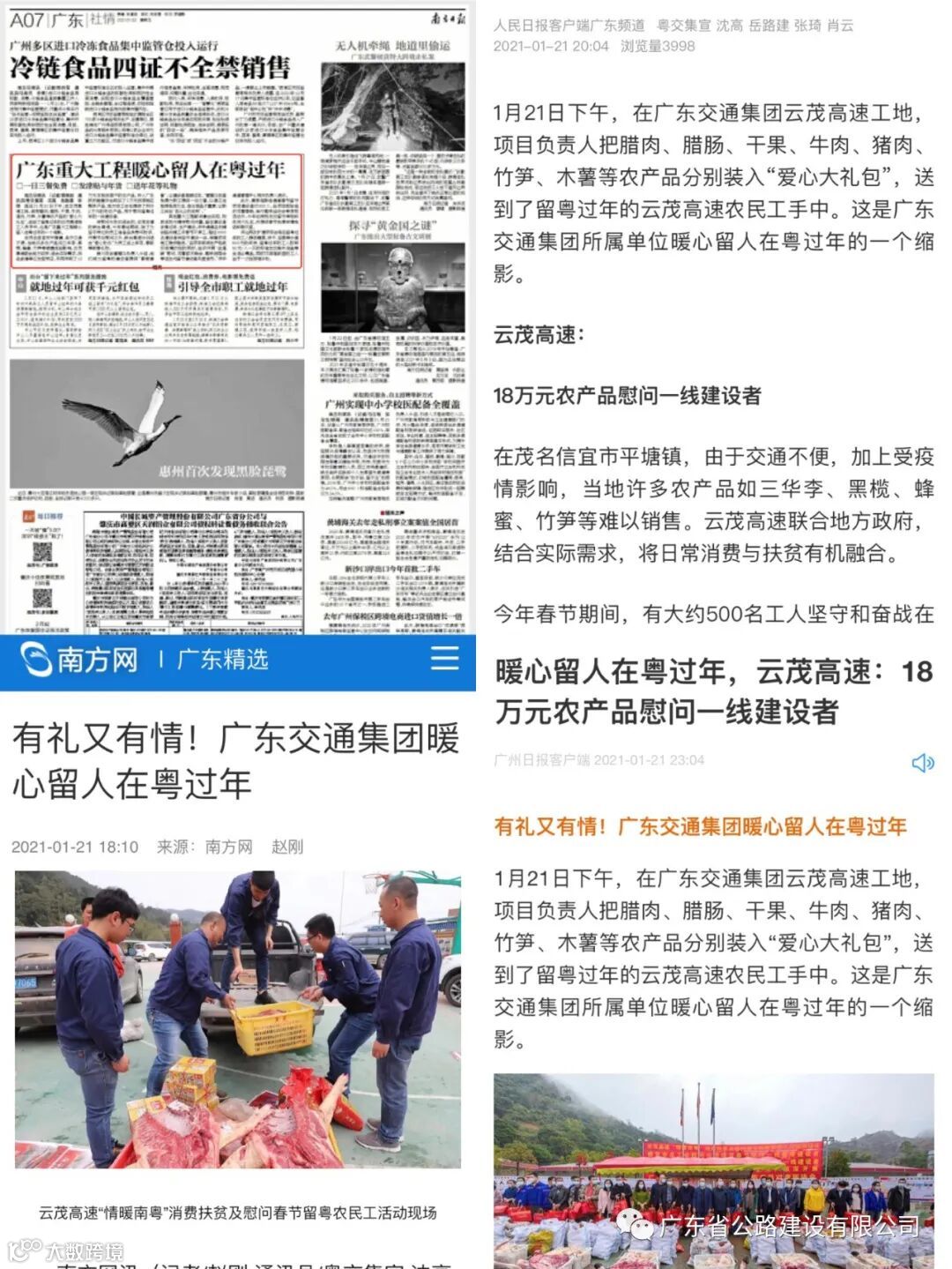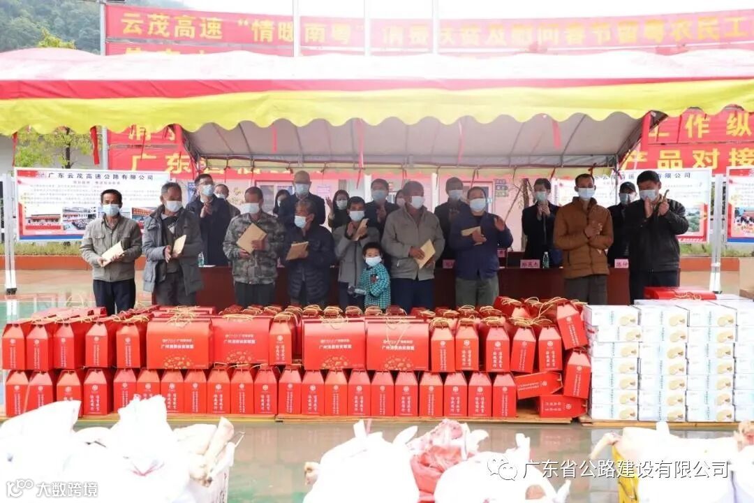 云茂高速向各参建单位发起号召,共同采购了13万元本地贫困户的农产品,并从广东扶贫销售平台购买了3万元贫困地区帮扶产品,地方总工会也提供了共计2万元的助农产品,用于慰问留粤过年的一线建设者。
