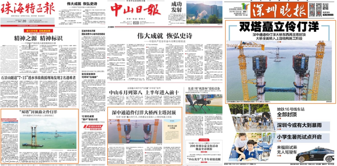 7月19日下午,粤港澳大湾区超级工程——深中通道伶仃洋大桥西主塔封顶,此前大桥东主塔已于今年6月17日封顶,标志着世界上最大跨径海中钢箱梁悬索桥——伶仃洋大桥两座主塔全部封顶,全面转入上部结构施工阶段。