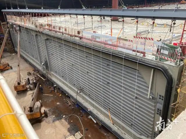 继6月17日首节沉管顺利实现与西人工岛暗埋段对接,7月25日下午1点,广州南沙龙穴岛码头上传来建设者们胜利的欢呼。深中通道最宽钢壳沉管E32管节浇筑完成并顺利出坞,刷新了世界上超宽管节在受限水域的出坞纪录,比预计工期提前了一个多月。