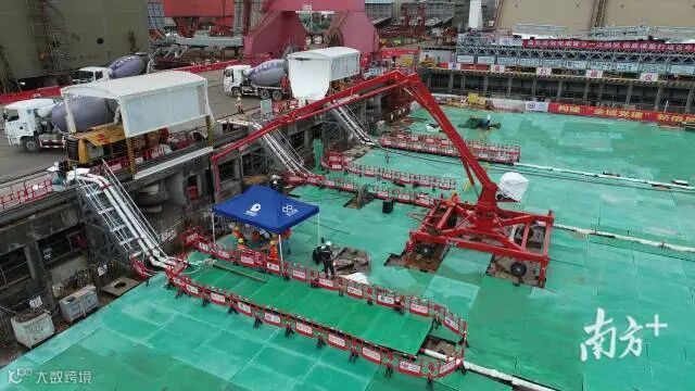 在工期屡屡提前的背后,超级工程所带来的技术创新,彰显着“湾区速度”的动力与底气。深中通道项目沉管预制厂地处伶仃洋牛头岛,现场机器轰鸣,工人们戴着口罩操作自如。在巨大的沉管底板上,智能浇筑系统正在精准地对舱隔进行着混凝土浇筑工作。现场为数不多的工作人员,一边盯着“数字化”控制系统,一边不时查看实时记录的统计数据。业主代表杨福林说:“这是我们自主研发的智能浇筑系统,比传统的浇筑效率高、风险低、稳定性高,更重要的是用传统方法浇筑一条生产线需要1000多名工人,智能浇筑只需要300多名工人。”