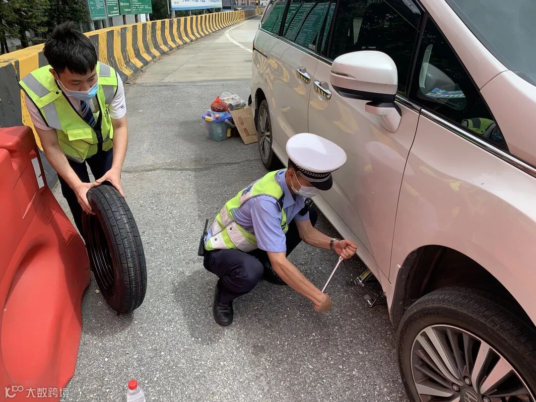 和备用轮胎,并叫来工作人员邱子鹏帮忙,帮助司机更换轮胎。十几分后,轮胎更换好了,司机继续踏上行程。