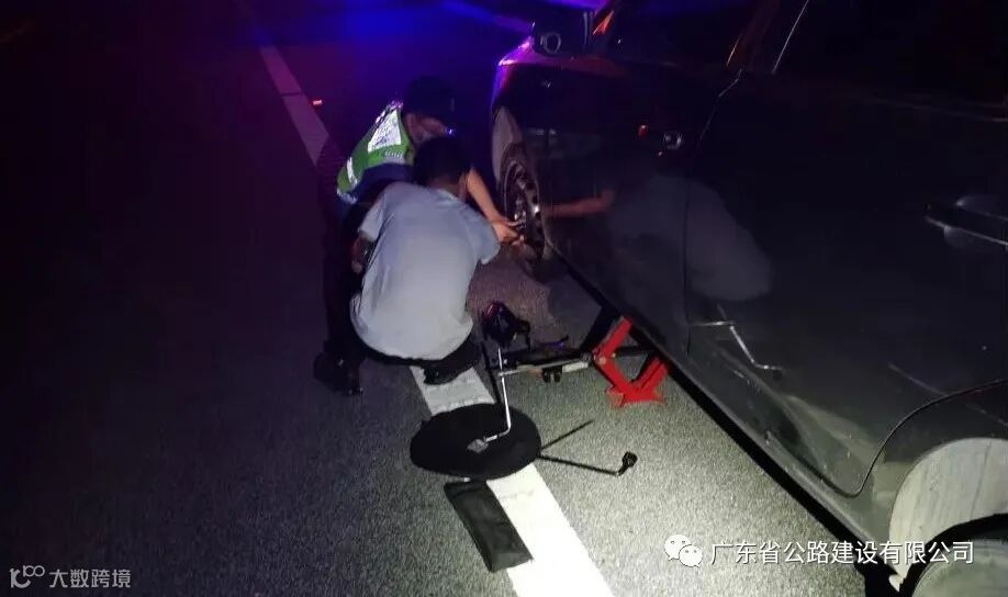 7月13日凌晨3时12分,江罗高速路政员何金瑞、苏春伟巡查至南行(高明往恩平方向)K166+500M处,发现一辆小车亮着双闪灯停在应急车道上,两人立即上前了解情况。原来,在行驶途中该车左前轮胎突然爆胎,但车上没有换轮胎的工具,此时正值凌晨,车主李先生十分着急。