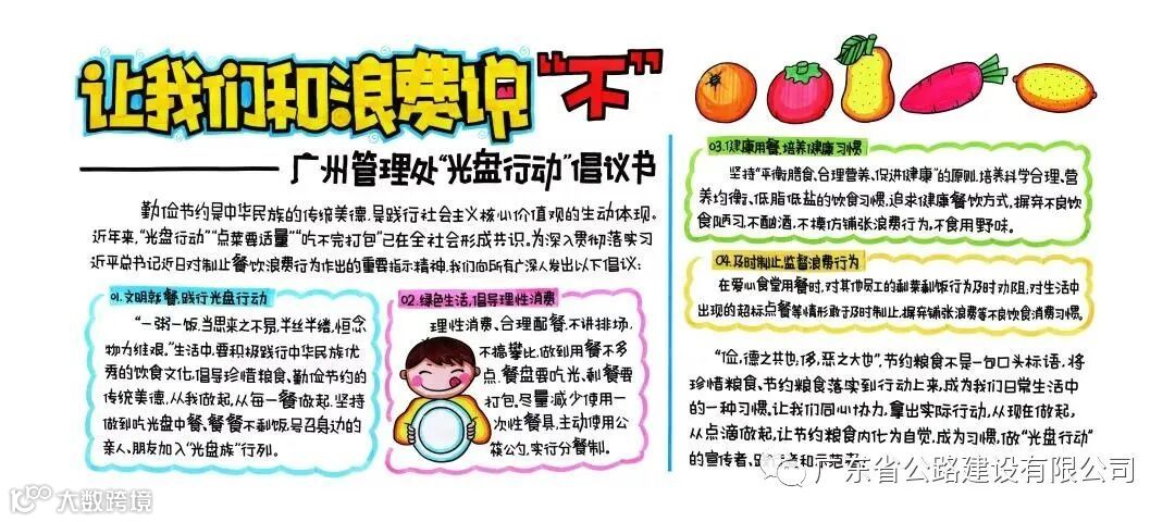 走进广深公司爱心食堂,就能看见公告栏上不定期展示由员工自行绘制的“光盘行动”倡议书,员工用自己手中的笔写下爱粮节粮的宣言,做“光盘行动”的倡导者,自觉养成厉行节约、反对浪费的习惯,让“爱粮节粮”的观念深植员工心中。