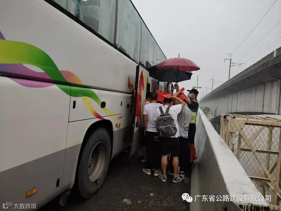 转运车赶到的时候,天上下起了雨,路政人员为司乘撑伞,协助乘客将行李安全转移至转运车上,并将所有乘客安全护送上车。