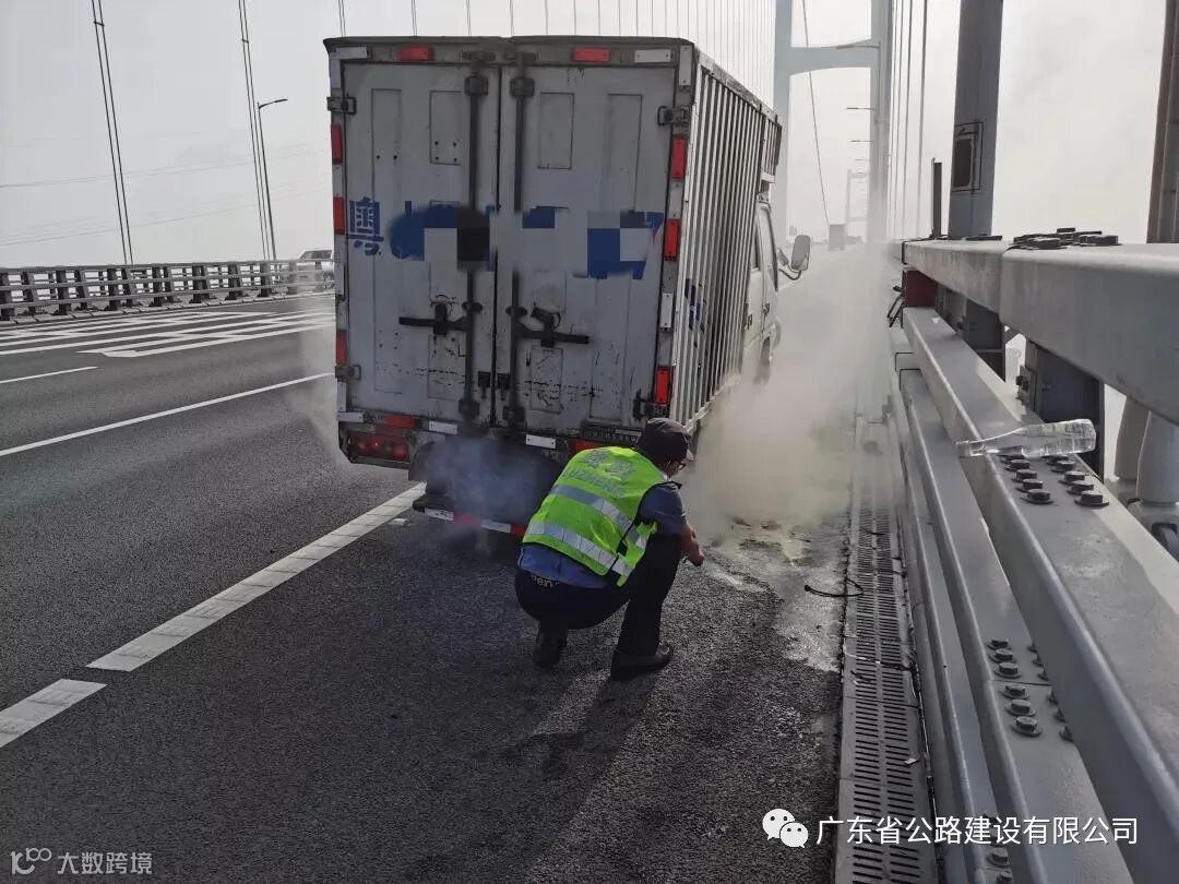 情况紧急,两名路政员仅用时3分钟便赶到现场,两人分工合作,路政员卢家亮在故障车后方做好安全防护,引导后方车辆通行;路政员黄梓豪上前了解情况。经询问,该车从东莞出发前往