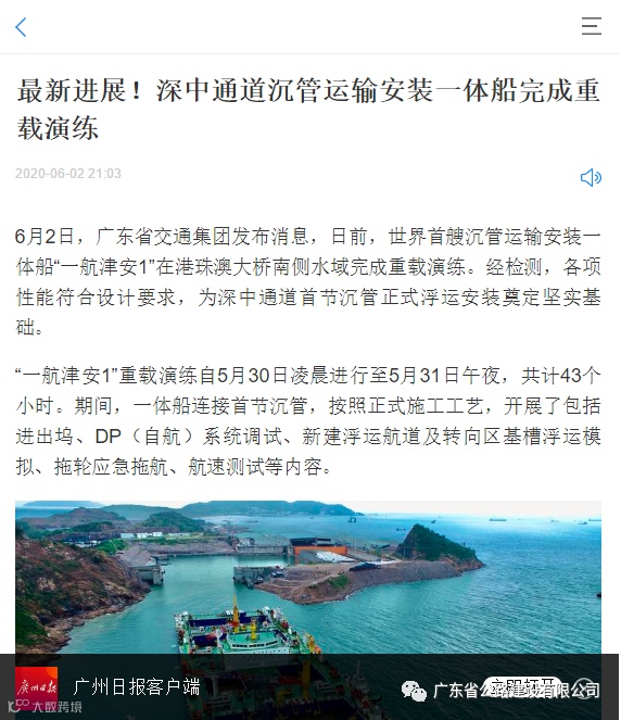近日,世界首艘沉管运输安装一体船“一航津安1”在港珠澳大桥南侧水域完成重载演练。经检测,各项性能符合设计要求,为深中通道首节沉管正式浮运安装打下坚实基础。