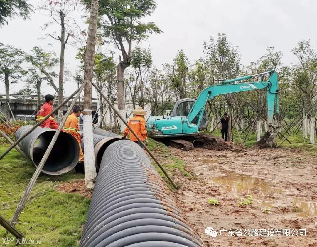 在解决横栏站外广场与地方路交接处积水时,江中公司采用在横栏站与横栏互通立交桥水塘之间,用挖掘机开通一条长约80米的水沟,埋设φ80厘米的橡胶波纹管,将横栏站外广场的水排至边沟再与横栏互通立交桥水塘连接的方式,有效地将横栏出入口外广场的积水引入到横栏互通立交桥水塘。