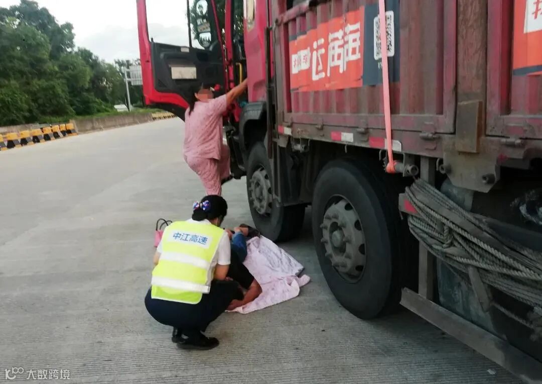 当天清晨5点48分,一辆皖籍四型货车从中江高速小榄站驶出高速后停靠在小榄站出口外广场。突然,一位中年女司乘神色慌张地从副驾驶室跳下后跑向驾驶室的位置。正站立于小榄站安全岛关注广场情况的工作人员邹琪恰好看到了这一幕,于是前去了解情况。