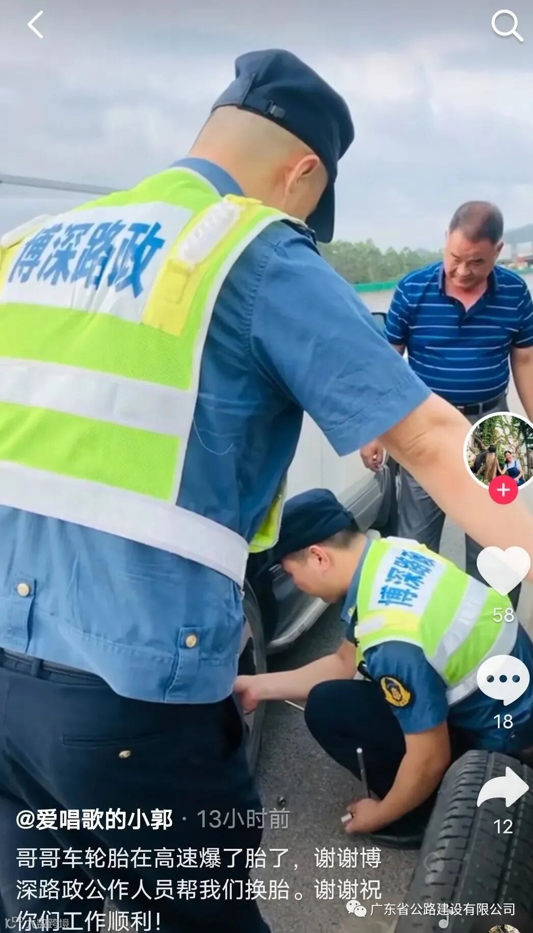 “辉哥,你们今天上抖音了,我们好多人都刷到这个视频。”听到同事的话,博深高速路政员邹金辉感到一头雾水。原来是5月20日邹金辉帮助司乘更换轮胎时,被车主拍成视频发上抖音了,以此向博深高速工作人员的帮助表示感谢。