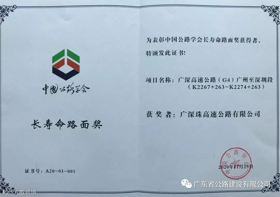 喜报!广深高速公路荣获全国首届“长寿命路面奖”