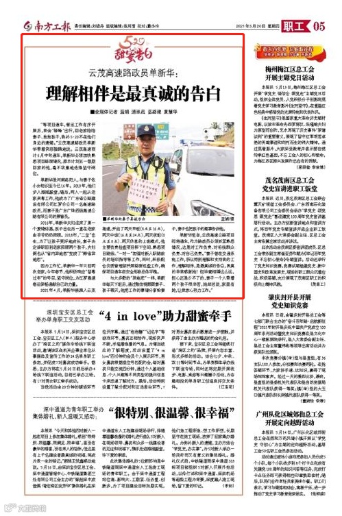 2021年4月,单新华被调入云茂高速,主要负责检查项目桥下空间、开展路面巡查、对新入职路政员进行培训等工作。单新华坦言,云茂高速即将通车,作为路政员必须抓紧熟悉路况,这是对工作和沿线群众负责。“妻子曾在交通系统工作,所以特别理解和支持我的工作,理解与相伴,是最真诚的告白,我真的非常感谢她!但毕竟相隔这么远,担心还是少不了的,妻子一个人带着两个孩子很辛苦,她却总说,家里有她,让我放心努力工作。”