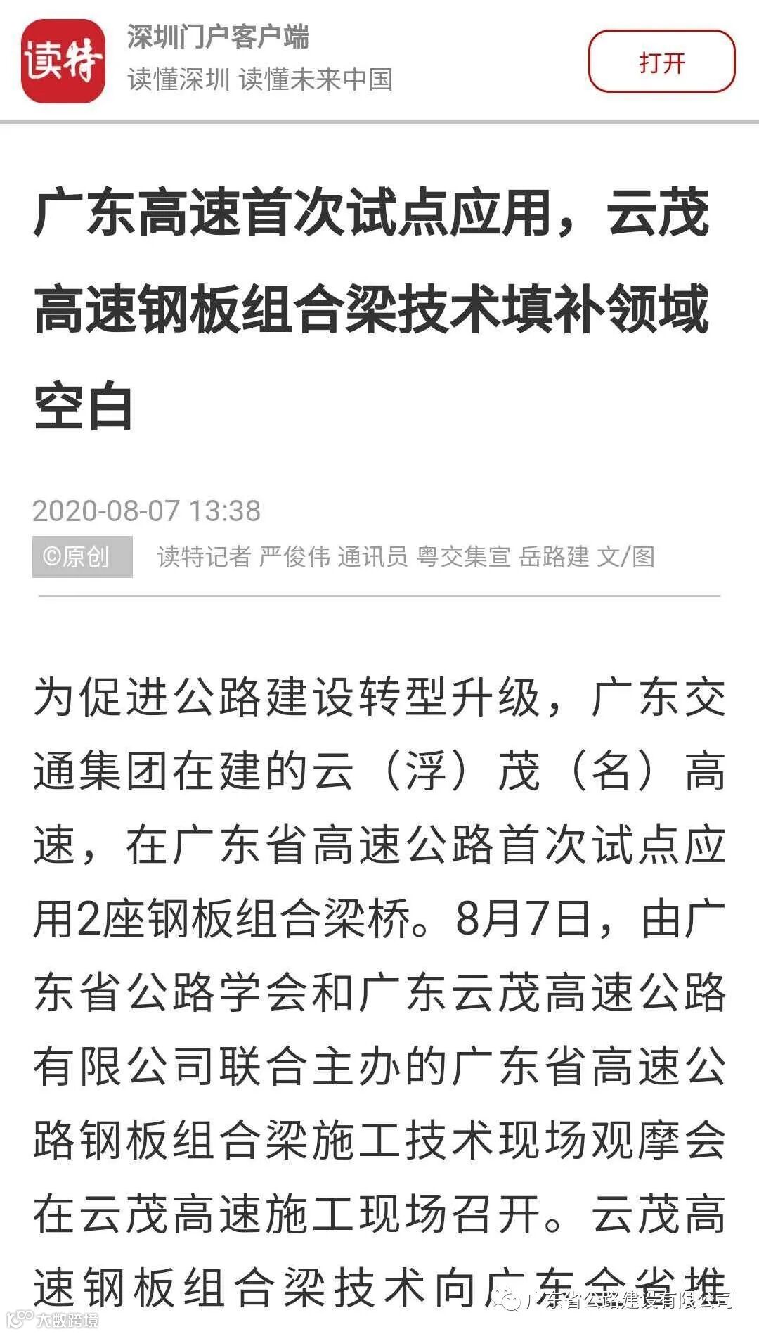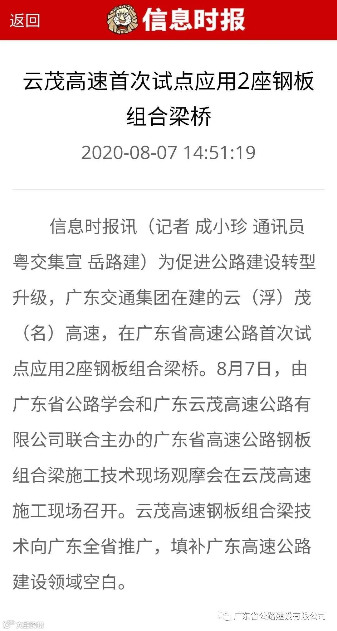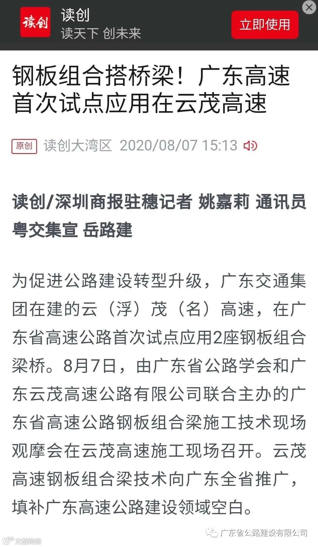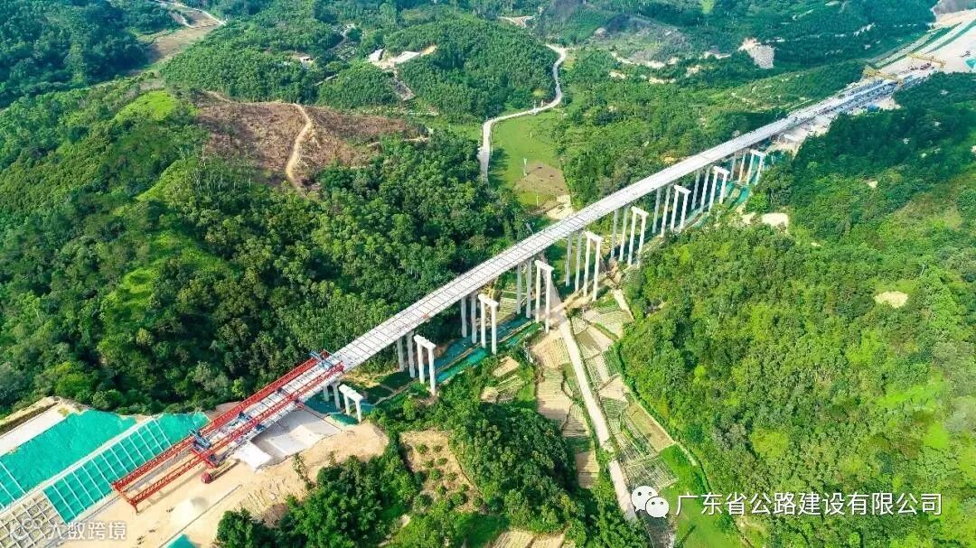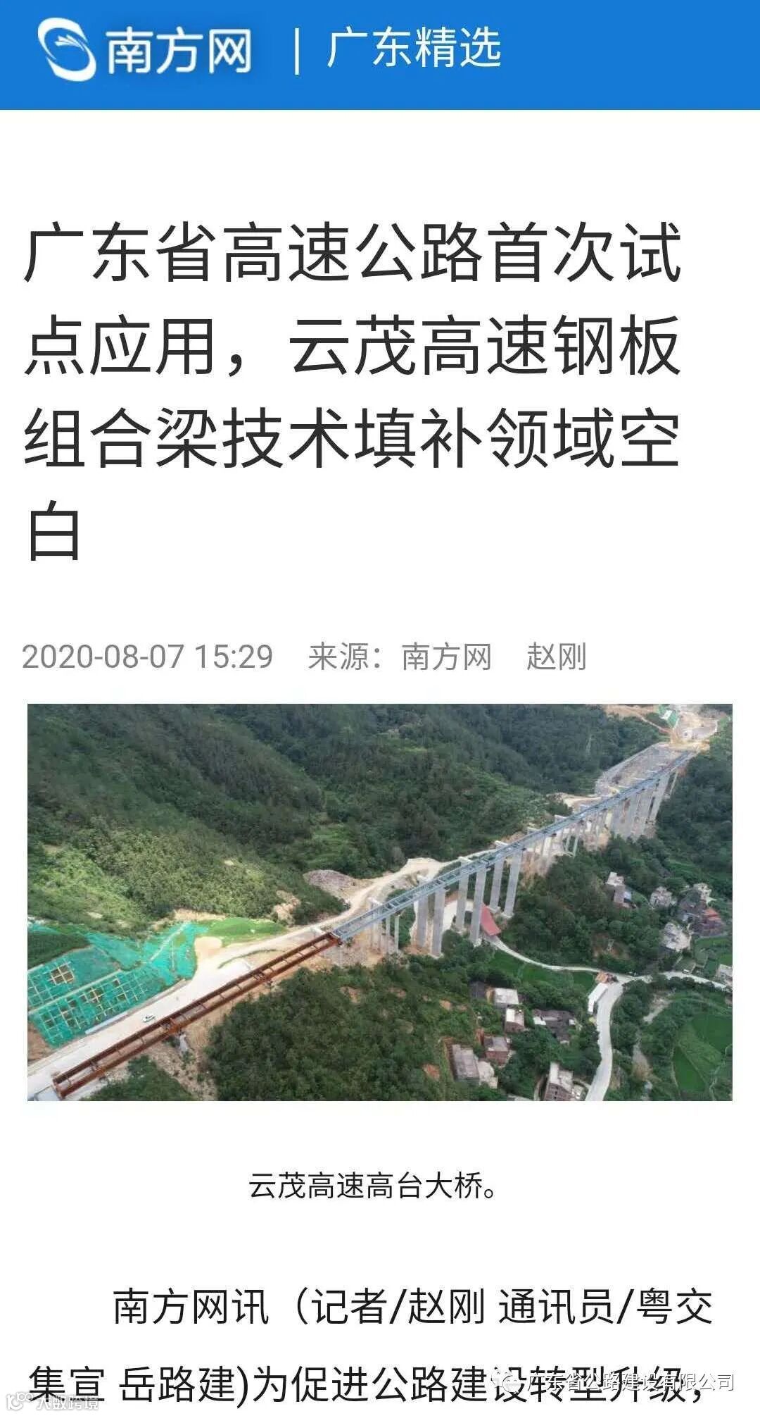 云茂高速沿线地貌以山岭及重丘为主,越岭段桥隧比高达66.64%,施工难度大。为推进工程进度,云茂高速借鉴技术成熟的外省经验,选定具有代表性的高台大桥、老屋村大桥2座桥梁试点应用,开展钢板组合梁桥设计与施工关键技术研究,成功实现标准化设计、工厂化预制、装配化施工,研究编制了符合广东高速公路实情的钢板组合梁桥建设标准图,有效提升公路桥梁的建设品质,促进公路建设转型升级,提质增效。