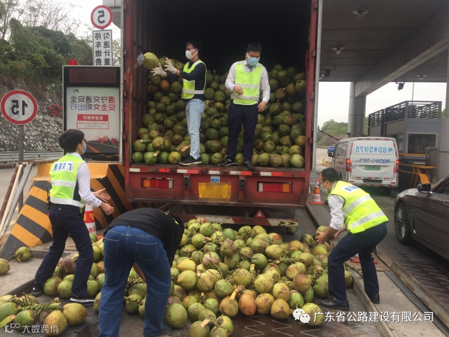 南头站工作人员帮助司机搬运椰子