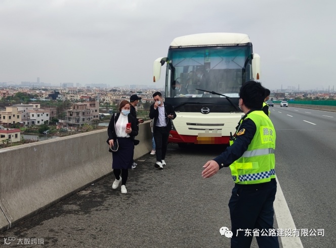 2月25日11时20分,广珠西线监控(客服)中心接中山交警报,东阜至中江互通路段南行K51+300处,一辆大客车发生故障,停在应急车道,车上有52名乘客滞留。广珠西线监控(客服)中心立即通知路政、交通拯救前往处置。10分钟后,路政、交警、拯救相继到达现场。路政人员周钦源、叶康成到场后,一人做好现场交通疏导;一人设置临时等候区,有序指引乘客转移至安全区域。