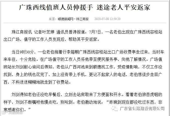 经广场值班站长刘剑耐心询问得知,这位老伯从广西河池来到广东顺德找工作,受疫情影响,不但工作没找到,在家带过来的钱也花完了。老伯想徒步走回广西,迷迷糊糊走到收费站。刘剑得知老伯还没吃早餐后,立刻去站房取来了方便面和开水。看着老伯狼吞虎咽的样子,刘剑不断嘱咐他慢点吃,别呛到。老伯激动地说:“我从昨晚到现在都没吃过东西,非常感谢你们。”