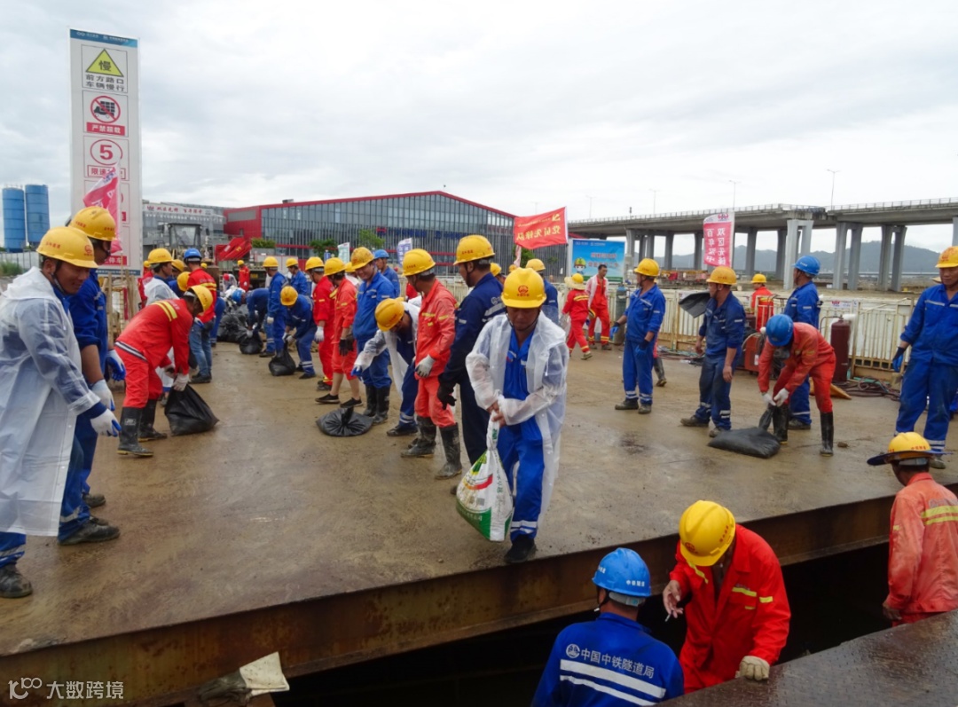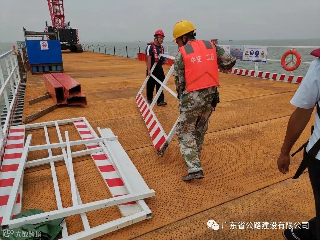深中通道S03合同段项目部组织人员在堰筑段钢便桥装填沙袋,并搬运到便桥底部维护,在堰筑段围堰周边,项目组织人员对周边排水孔进行堵塞,防止海水涌入堰筑段现场。