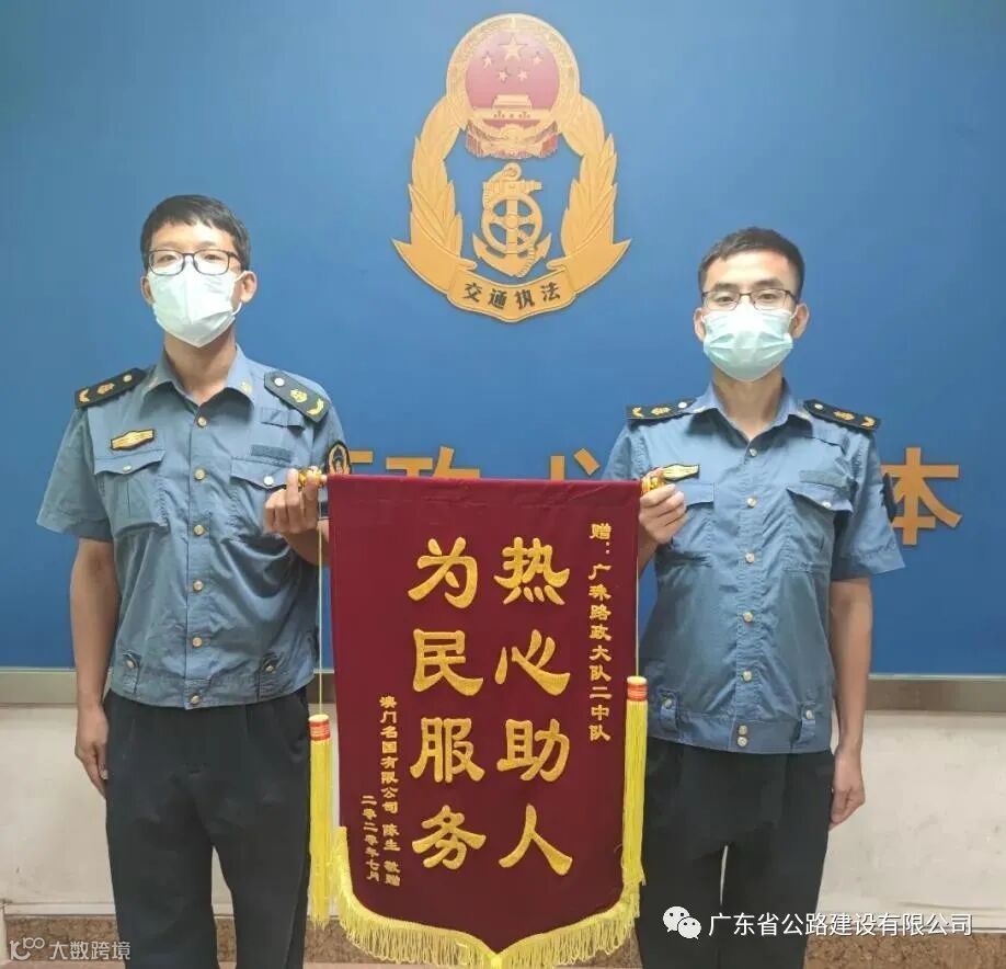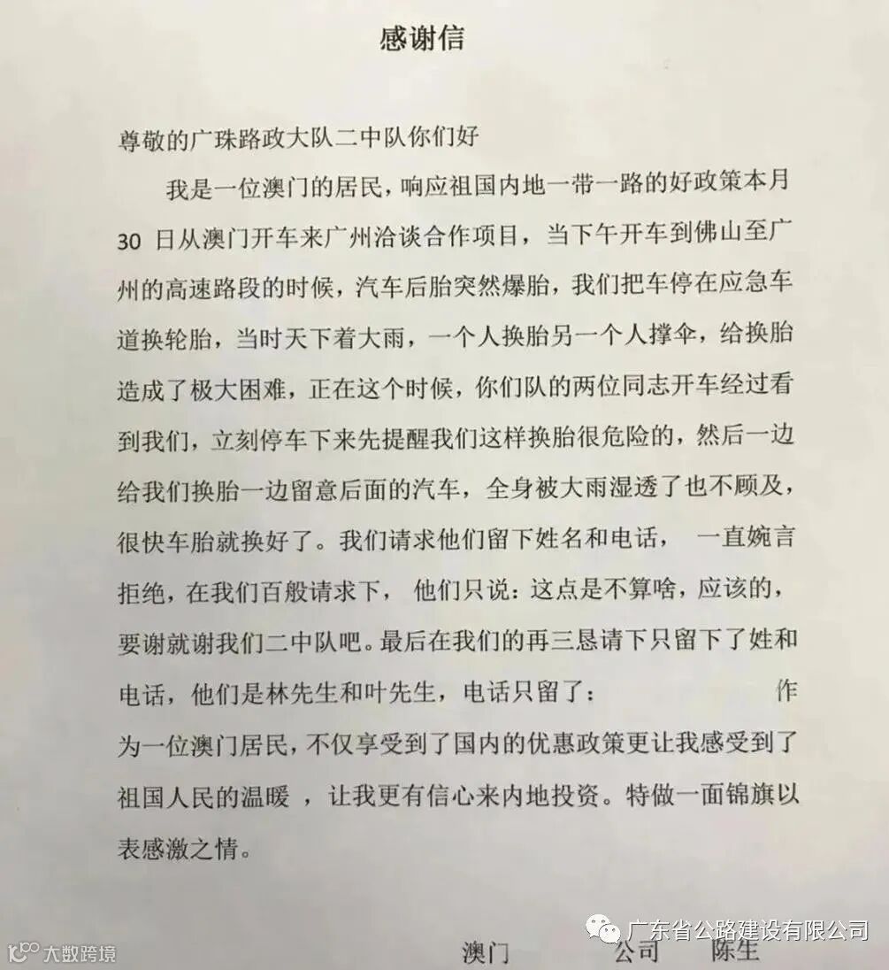 原本以为只是一件再普通不过的小事,谁知第二天陈先生就通过微信联系了路政员林振挺,要来了广澳高速管理中心的地址并寄来了锦旗和感谢信。受到司乘人员如此郑重的感谢,路政员叶锦波感到很惊喜。他说:“遇到节假日的时候,我们一天能帮司机换上四五次轮胎,这实在是一件不足挂齿的小事,但还是很感谢陈先生对我们工作的认可。”
