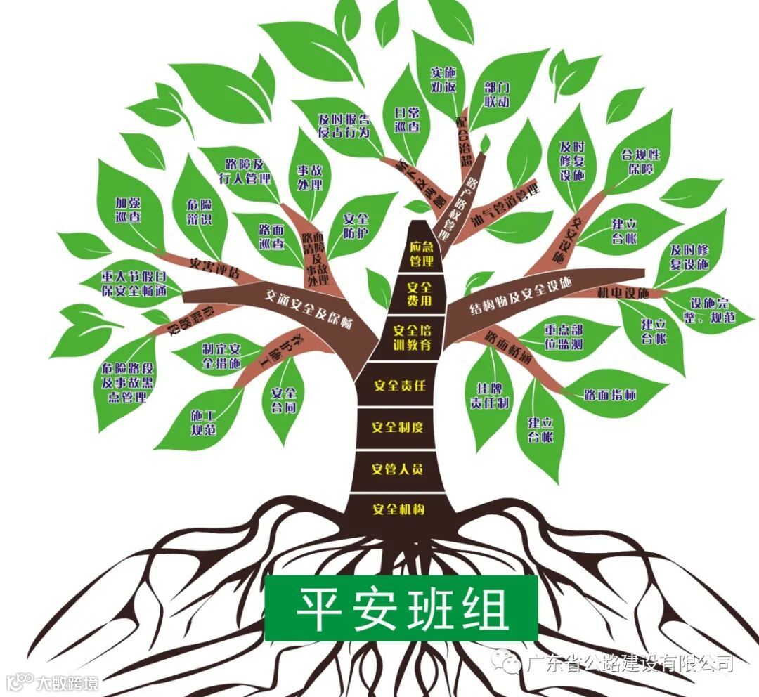 “平安树”模型,是江中公司结合“平安公路”示范路建设活动,并借鉴植物的生长规律,整合不同层面的安全管理工作,以“平安班组”建设作为根部;以安全管理体系建设作为树干;以结构物及安全设施管理、运营交通安全及保畅管理、路产路权安全管理等工作作为枝叶;以安全文化建设作为生长环境,形成的较为完善的一套高速公路营运企业安全管理理论体系。