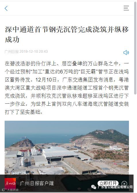 在碧波浩渺的伶仃洋上、层峦叠嶂的万山群岛之中,一个经过预制“加工”重达约6万吨的“巨无霸”管节正在浅坞区蓄势待发。12月10日,粤港澳大湾区重大战略项目深中通道隧道工程首个钢壳沉管完成浇筑,并顺利攻克沉管纵移难题移至浅坞区进行下一步作业,为世界上首例双向八车道海底沉管隧道安装打下了坚实基础。