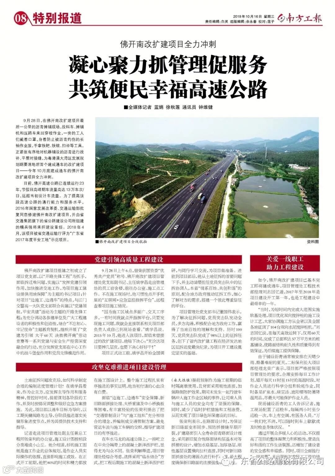 10月16日,《南方工报》以“凝心聚力抓管理促服务 共筑便民幸福高速公路”为题,专题报道了佛开南改扩建项目在为佛开高速公路扩容提质中所付出的细心、认真,不断加快项目建设满足人民群众美好出行的需要,以下为报道全文: