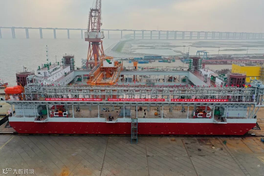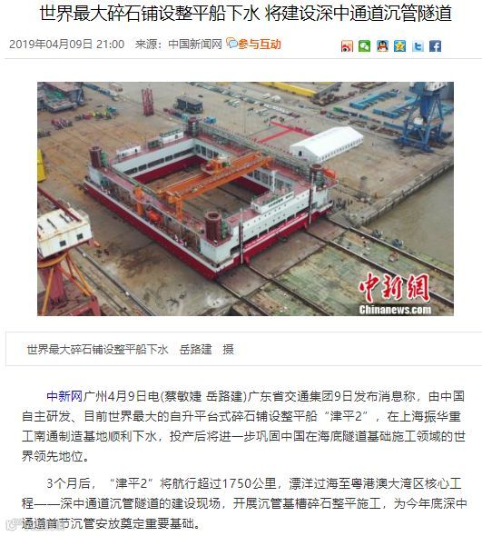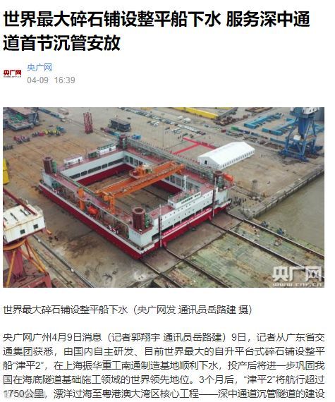 4月9日,由国内自主研发、目前世界最大的自升平台式碎石铺设整平船“津平2”,在上海振华重工南通制造基地顺利下水,投产后将进一步巩固我国在海底隧道基础施工领域的世界领先地位。3个月后,“津平2”将航行超过1750公里,漂洋过海至粤港澳大湾区核心工程——深中通道沉管隧道的建设现场,开展沉管基槽碎石整平施工,为今年底深中通道首节沉管安放奠定重要基础,标志着项目建设有了实质性进展。
