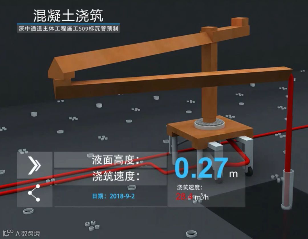 智能浇筑系统是对沉管仓格进行精准浇筑的新型平台,通过对混凝土生产及浇筑等全过程监控,实时记录统计数据,实现高流动自密实混凝土的过程控制,以控制下料高度、浇筑速度等精细化手段控制每个仓格的浇筑过程,具有效率高、风险低、稳定性高等优点,超越了行内的传统施工技术,极大提高了沉管浇筑效率和质量,沉管预制预计可缩短至30天/节。