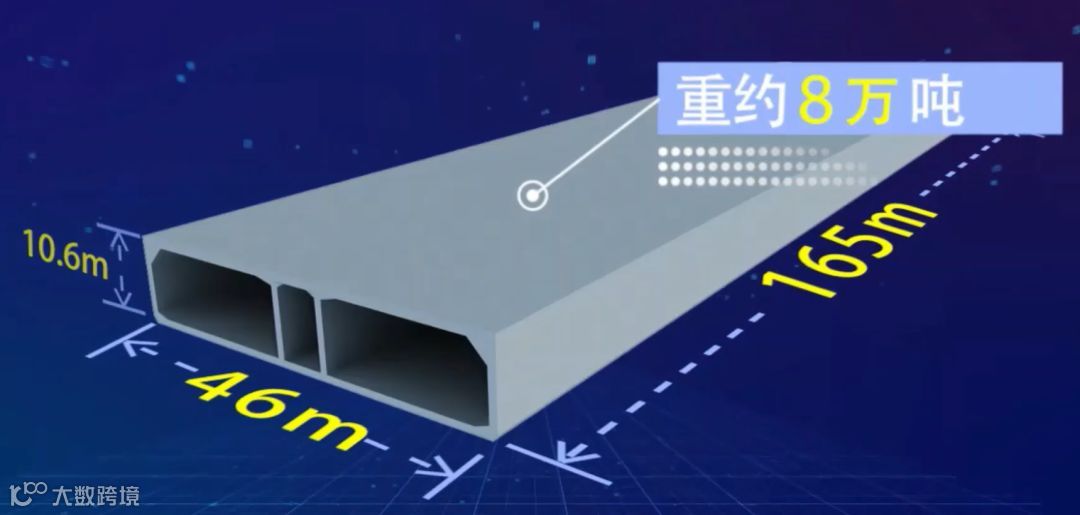 深中通道沉管隧道每个标准管节的尺寸为165×46×10.6米,用钢量约1万吨,其排水量相当于一艘中型航空母舰。