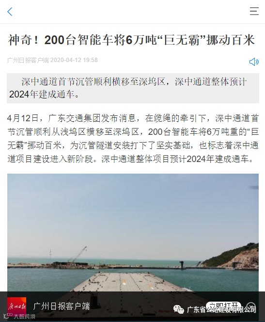 4月12日,在缆绳的牵引下,深中通道首节沉管顺利从浅坞区横移至深坞区,为沉管隧道安装打下了坚实基础,也标志着深中通道项目建设进入新阶段。