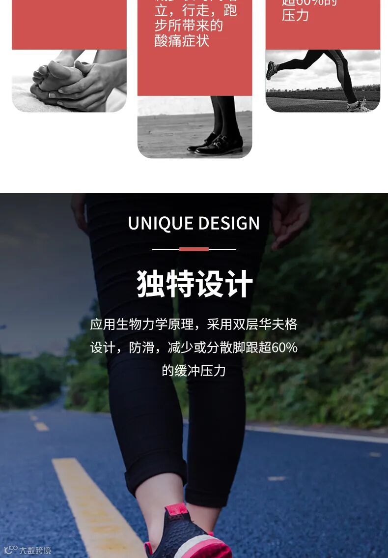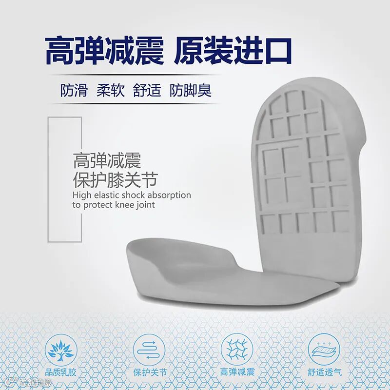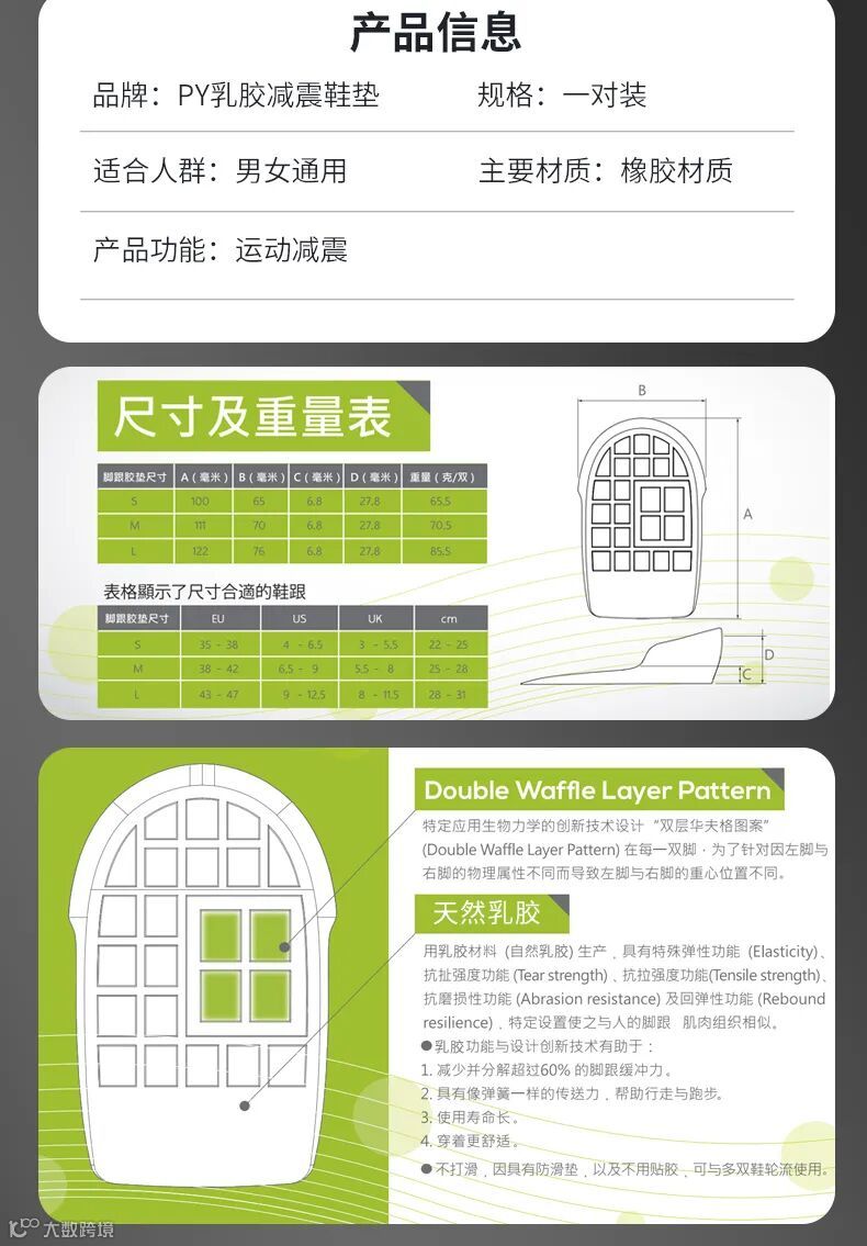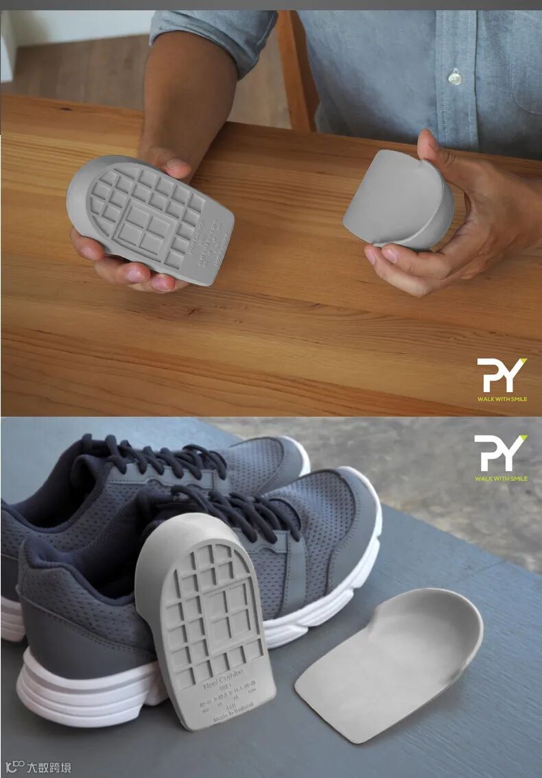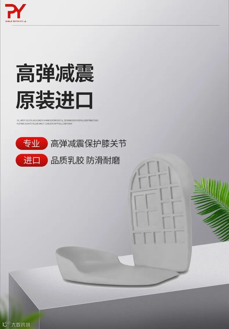 PY乳胶减震鞋垫,应用生物力学原理,采用双层华夫格设计,防滑,减少或分散脚跟超60%的缓冲压力。